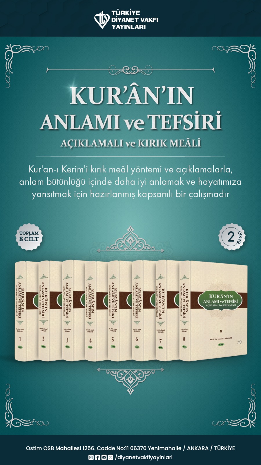 Türkiye Diyanet Vakfı Yayınları’nın sekiz ciltlik “Kur’ân’ın Anlamı ve Tefsiri” adlı çalışması, Kur’ân-ı Kerim’i anlayarak okumamızı sağlayacak kapsamlı içeriğiyle dikkat çekiyor. Prof. Dr. İsmail Karagöz tarafından hazırlanan seri, İslami kitaplar alanına önemli bir katkı sağlıyor.