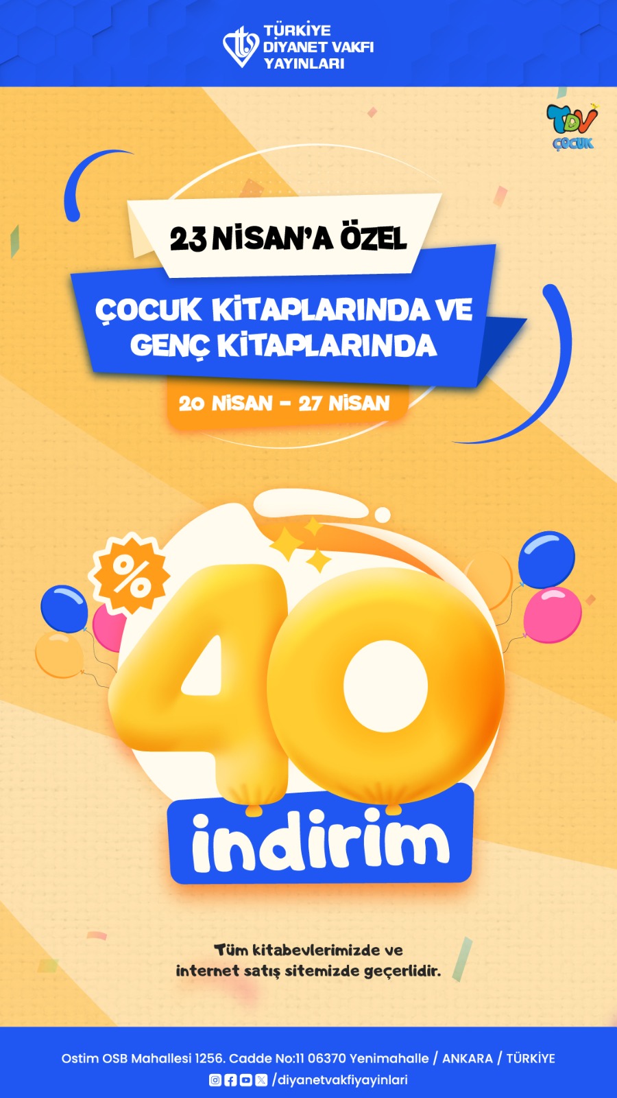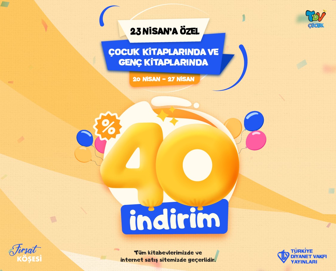 Türkiye Diyanet Vakfı Yayınları’ndan 23 Nisan Haftasında Çocuklara Özel Kampanya   23 Nisan Ulusal Egemenlik ve Çocuk Bayramı, Türkiye Diyanet Vakfı Yayınları’nda çocukları sevindirecek bir kampanya ile kutlanıyor. 20-27 Nisan tarihleri arasında bir hafta boyunca geçerli olan kampanya, tüm çocuk kitaplarında %40 indirim imkânı sağlıyor. Genç kitaplarını da kapsayan kampanya büyük indirim oranı ile dikkat…